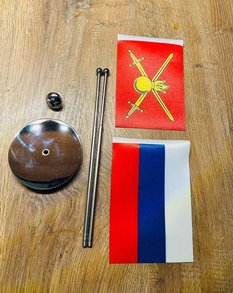Прекрасный и оригинальный подарок себе, а также на подарок другу или боевому товарищу. Сувенир состоит из двух флажков на двойном флагштоке, который крепится на двух рожковую подставку. Подставка крепится к ровной поверхности с помощью двухстороннего скотча. материал флажков: сатин, который не боится ультрафиолетовых лучей, отлично смотрится на панели автомобиля.